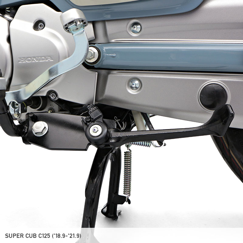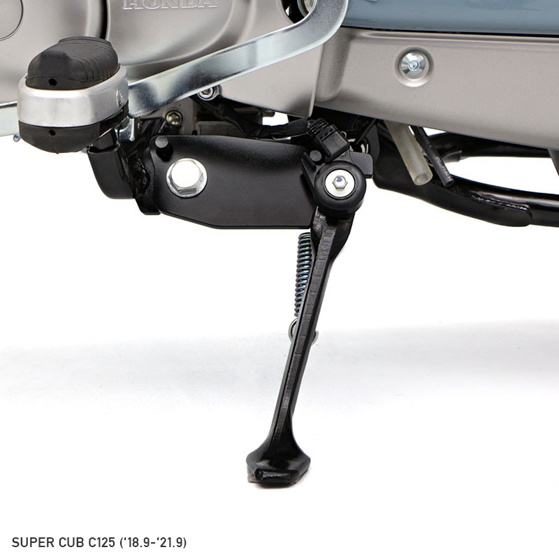 スーパーカブC125用の強化(安定化)サイドスタンドブラケット ノーマルサイドスタンドでは、荷台部に多めの積載を行った場合、車両後方に荷重が偏るため、