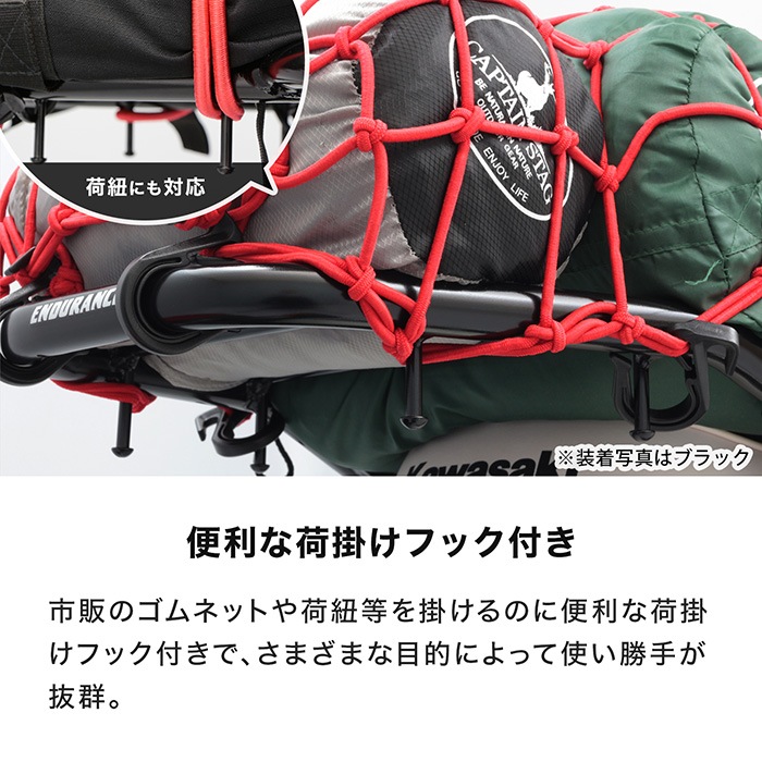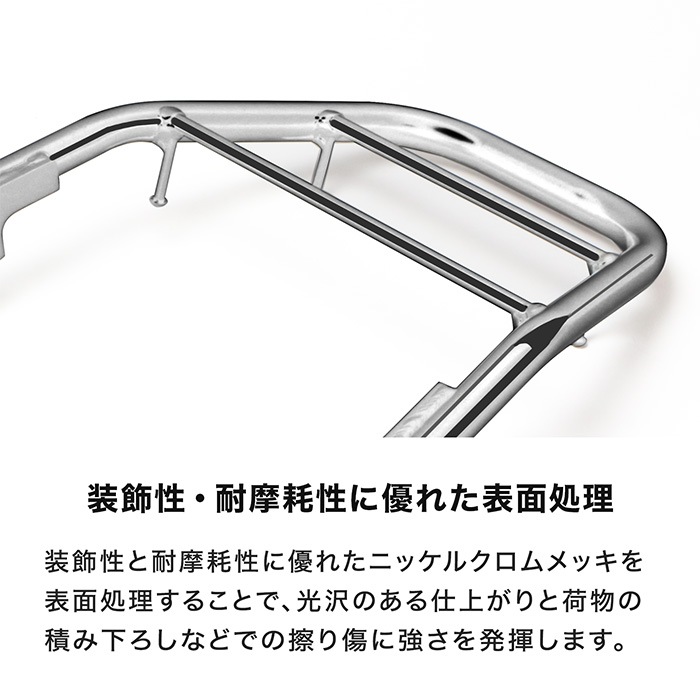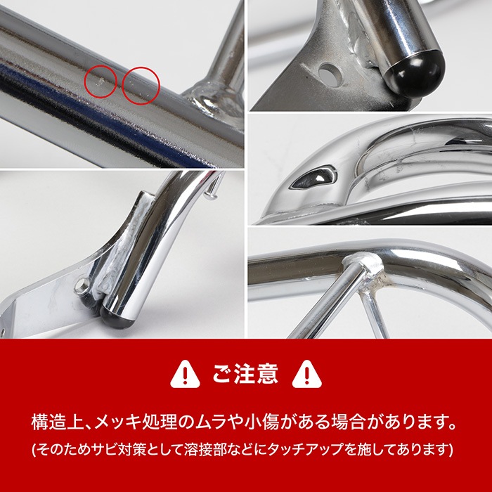 ● 一般的にメッキ表面処理はその性質上、材料自体の小傷等が見えたり、溶接部、ステー周辺部、 穴あけ加工部など複雑な形状をしている箇所では、ムラが発生するためご使用の環境やメンテナンス状況によっては、ザビが発生する可能性があります。その為タッチアップペイントなどを施している箇所もありますので、お手入れ等を行う際には、ガソリンやシンナー等の溶剤はご使用しないでください。また、サビが発生した場合には、サビを取り除きその部分にサビ止めペイントをするなどのメンテナンスを行い劣化を抑えることをオススメします。(気になる方は黒塗装モデルをおすすめします) ● (※1)全てのメーカー/タイプの汎用ベースに対応することを保証するものではありません。また、汎用ベース取付け例の写真に使用されているキャリアは本商品とは異なります。 ● ※キャリアの後端より15cmを超えて荷物積んだり、ボックスベースの1/4以上をキャリア後端より後へ出した状態で使用しないでください。 ● 本商品は、純正ノーマル車両への取り付けを前提としていますので、それ以外の部品との同時取り付けや本商品取り付け周辺の変更がある車両への取り付けは保証できませんのでご了承ください。 ● ヘルメットホルダーを取り付けた際は、走行時ヘルメットホルダーに物を掛けたまま走行しないでください。 ● (※)取付時間は、オートバイに関する整備の一般的な知識および技能を有する国家資格をお持ちの整備士の方で、かつ必要な工具をすでにお持ちの方を前提としております。 ● 適合確認車種に記載のある車種以外の取り付け確認はしておりません。記載されていない車種は取付不可・または未確認です。 ● 適合確認車種に記載のない車種への取り付けは、保証いたしかねます。 ● 商品の色味は撮影条件やモニター、商品ロットやセット商品の左右で異なる場合もございますが、返品・交換等はお受けいたしかねます。 ● 本商品は商品の形状および製造工程の特性上、着色時の電極痕やエアだまりによる色ムラが発生します。 ● 積載量を超えないようにご利用ください。 ● ご購入前に、必ず取扱説明書に記載の内容をご確認ください。 |