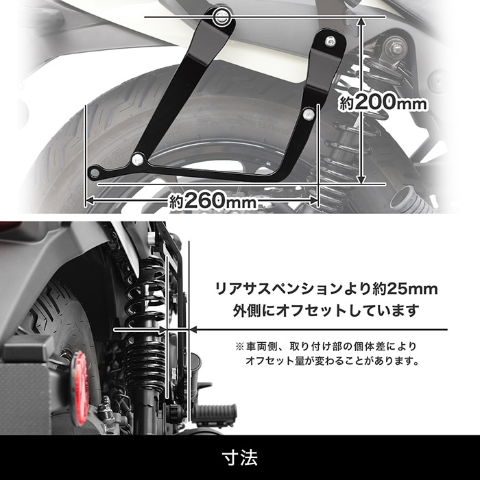 ● 本商品は、弊社製シートバッグサポートグリップキャリアと同時取り付けを前提としていますので、それ以外の部品との同時取り付けや本商品のみで車両への取り付けはできませんのでご了承ください。 ● 取扱説明書(組合せ表)に記載以外の同時取り付けについては不明ですのでご了承ください。 ● 本商品を取り付けた場合に、車体側の取り付け面やその周辺に傷が付く可能性がありますので了承ください。 ● サイドバッグとの摩擦等(擦れ)で塗装がはがれる場合がありますので、あらかじめ御了承ください。お使いのバッグと擦れる部分にあらかじめラバー/テープ等を貼って保護することをおすすめします。 ● サイドバッグの総重量を、左右各5kgまででご使用ください。 ● (※)取付時間は、オートバイに関する整備の一般的な知識および技能を有する国家資格をお持ちの整備士の方で、かつ必要な工具をすでにお持ちの方を前提としております。また、取付時間の参考ですので、工賃等の目安にはなりません。 ● 適合確認車種に記載のある車種以外については、取付不可または未確認であり取り付けは保証いたしかねます。 ● 商品の色味は撮影条件やモニター、商品ロットやセット商品の左右で異なる場合もございますが、返品・交換等はお受けいたしかねます。 ● 本商品は商品の形状および製造工程の特性上、着色時の電極痕やエアだまりによる色ムラが発生します。 ● ご購入前に、必ず取扱説明書に記載の内容をご確認ください。 ● 取扱説明書は環境問題を配慮しペーパーレス化の一環として電子化とさせていただいております(商品に同梱しておりません)お手数ではございますが公式WEBサイトよりご確認をお願いいたします。 ● 本商品は、純正ノーマル車両への取り付けを前提としていますので、それ以外の部品との同時取り付けや部品自体の変更がある・本商品取り付け周辺の変更がある車両への取り付けは保証できませんのでご了承ください。 |