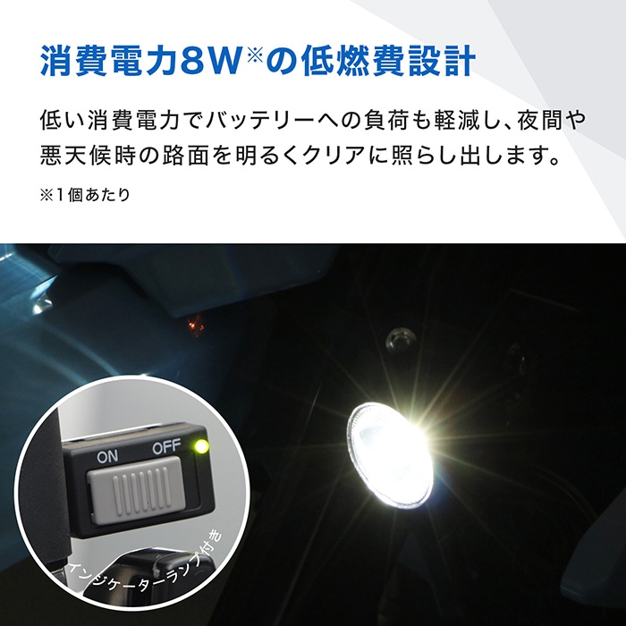 ・低消費電力(1個8W/2個合計16W)なのでバッテリーに優しい設計です。