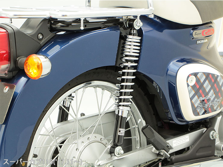 他車種で好評だったリアサスペンションがカブ用として登場! スタンダードのサスペンションより少し硬めのダンパー設定にすることで