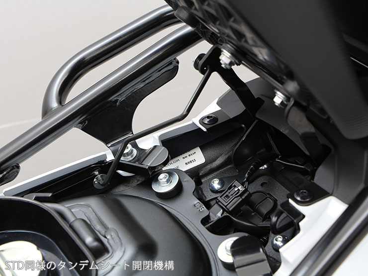 最大積載量UPでリニューアル! 再度強度テストを行い最大積載量がアップしました。 ガソリン給油時にもピニオンシートの開閉機構がSTD同様になっているので開けた状態を保持でき、ガソリン給油もスムーズ! |