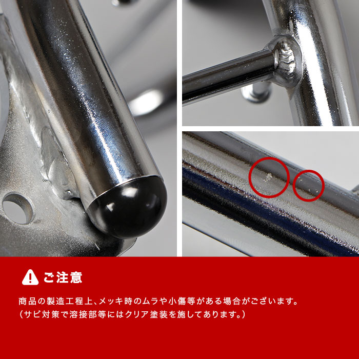● 一般的にメッキ表面処理はその性質上、材料自体の小傷等が見えたり、溶接部、ステー周辺部、 穴あけ加工部など、複雑な形状をしている箇所では ムラが発生するためご使用の環境やメンテナンス状況によっては、ザビが発生する可能性があります。その為 タッチアップペイントなどを施している箇所もありますので、お手入れ等を行う際には、 ガソリンやシンナー等の溶剤はご使用しないでください。また、サビが発生した場合には、サビを取り除きその部分にサビ止めクリアペイントをするなどのメンテナンスを行い劣化を抑えることをオススメします。(気になる方は黒塗装モデルをおすすめします) ●(※1)全てのメーカー/タイプの汎用ベースに対応することを保証するものではありません。また、汎用ベース取り付け例の写真に使用されているキャリアは本商品とは異なります。 ● ※キャリアの後端より15cmを超えて荷物積んだり、ボックスベースの1/4以上をキャリア後端より後へ出した状態で使用しないでください。 ● ヘルメットホルダーを取り付けた際は、走行時ヘルメットホルダーに物を掛けたまま走行しないでください。 ● (※)取付時間は、オートバイに関する整備の一般的な知識および技能を有する国家資格をお持ちの整備士の方で、かつ必要な工具をすでにお持ちの方を前提としております。 ● 適合確認車種に記載のある車種以外の取り付け確認はしておりません。記載されていない車種は取付不可・または未確認です。 ● 適合確認車種に記載のない車種への取り付けは、保証いたしかねます。 ● 商品の色味は撮影条件やモニター、商品ロットやセット商品の左右で異なる場合もございますが返品・交換等はお受けいたしかねます。 ● 本商品は商品の形状および製造工程の特性上、着色時の電極痕やエアだまりによる色ムラが発生します。 ● 積載量を超えないようにご利用ください。 |