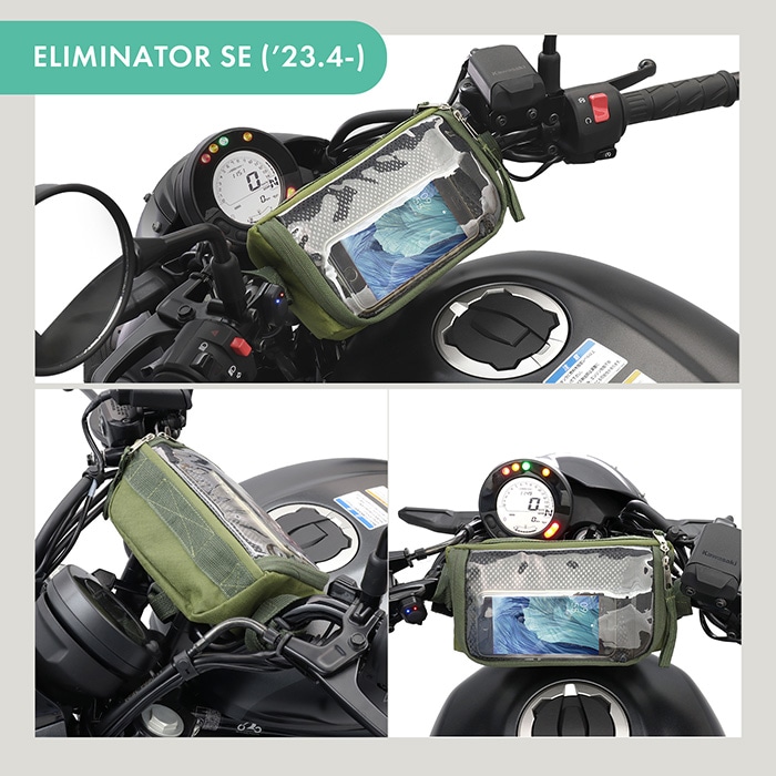 スマホと長財布+αくらいが収まる、ちょい出かけにちょうど良いサイズ感のフロントバッグです。 スマホポケット上部はクリアーなので外側から確認でき、 スマホ背面側にはメッシュ素材を使用して熱をこもりづらくしました。 ダブルファスナーの紐はグローブでも扱いやすいように長めに、ケーブル通し穴も装備しています。 マジックテープタイプのベルトを3本付属。 1本を底面のベルトホルダーに通しハンドル中央に固定。 残りの2本をバッグの両サイドに通しハンドルの間に固定したり、 バッグ背面に通しクロスバーに固定したりと、 車両や用途に応じてベルト位置の変更が可能です。 バッグ上部は広く開くので、中身が確認しやすく取り出しやすくなっています。 サイドのベルトホルダー部分に1箇所Dカンを装備しているので、バイクを離れる際にはバッグを取り外して お手持ちのカラビナやキーフックなどに掛けて身に着けることも可能です。