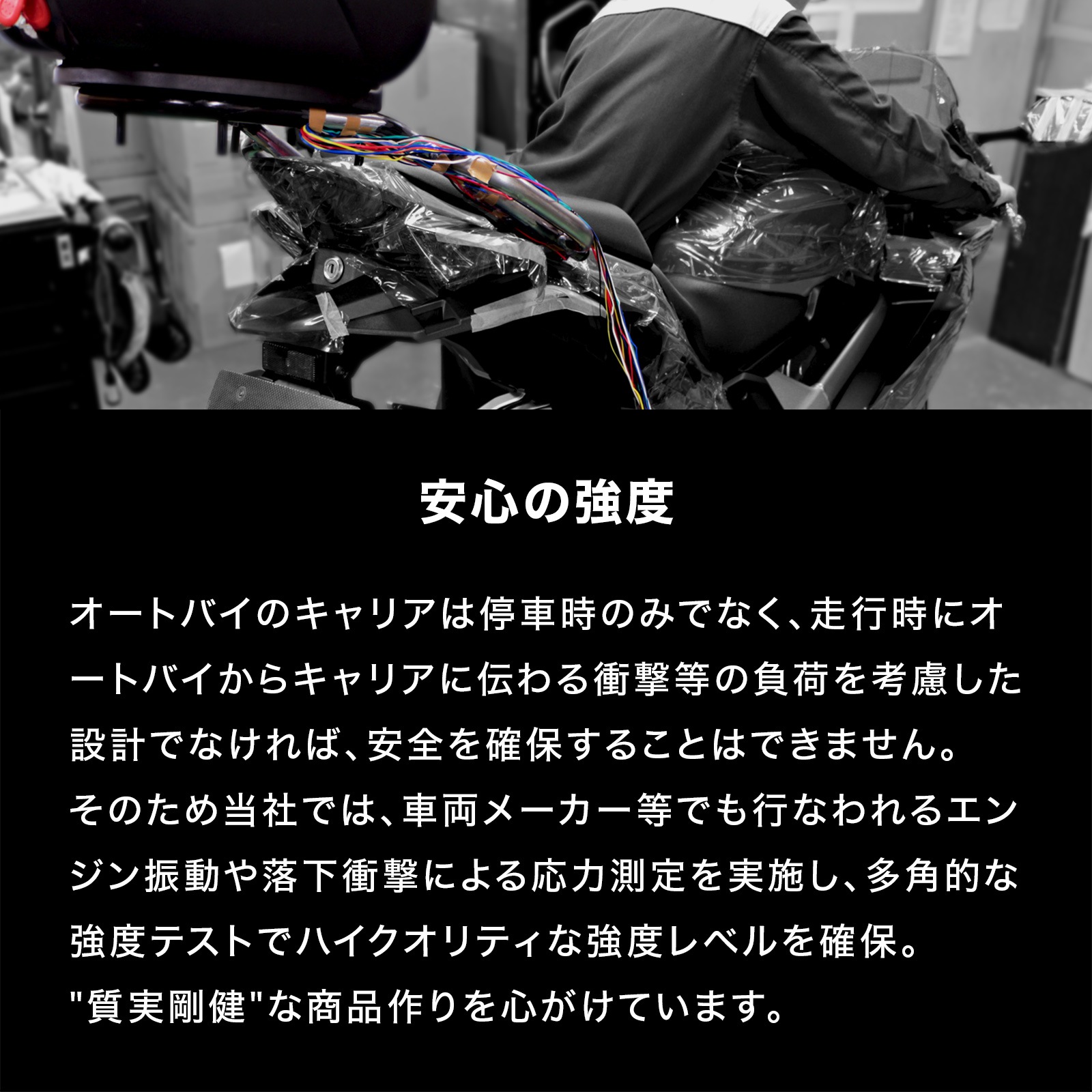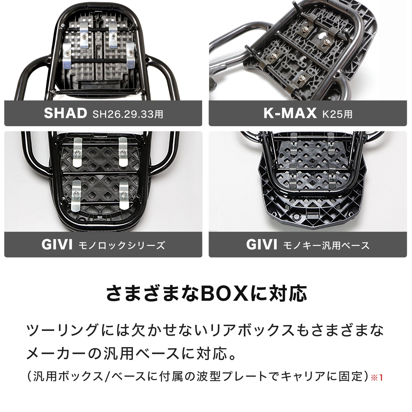 ●(※1)全てのメーカー/タイプの汎用ベースに対応することを保証するものではありません。また、汎用ベース取付け例の写真に使用されているキャリアは本商品とは異なります。 ●※キャリアの後端より15cmを超えて荷物積んだり、ボックスベースの1/4以上をキャリア後端より後へ出した状態で使用しないでください。 ●本商品は、純正ノーマル車両への取り付けを前提としていますので、それ以外の部品との同時取り付けや本商品取り付け周辺の変更がある車両への取り付けは保証できませんのでご了承ください。 ●ヘルメットホルダーを取り付けた際は、走行時ヘルメットホルダーに物を掛けたまま走行しないでください。 ●(※)取付時間は、オートバイに関する整備の一般的な知識および技能を有する国家資格をお持ちの整備士の方で、かつ必要な工具をすでにお持ちの方を前提としております。 ●適合確認車種に記載のある車種以外の取り付け確認はしておりません。記載されていない車種は取付不可・または未確認です。 ●適合確認車種に記載のない車種への取り付けは、保証いたしかねます。 ●商品の色味は撮影条件やモニター、商品ロットやセット商品の左右で異なる場合もございますが、返品・交換等はお受けいたしかねます。 ●本商品は商品の形状および製造工程の特性上、着色時の電極痕やエアだまりによる色ムラが発生します。 ●積載量を超えないようにご利用ください。 ●ご購入前に、必ず取扱説明書に記載の内容をご確認ください。 |