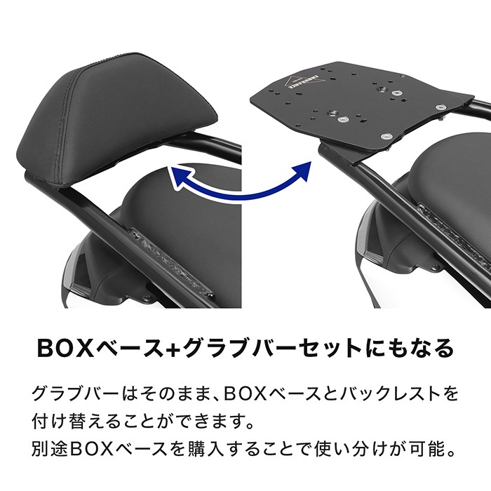 また、別途でアルミBOXベース(※下部おすすめ商品参照)をご購入いただくことで、バックレスト部分を付け替えるだけでアルミBOXベース+グラブバーセットとしてもご使用いただけます。