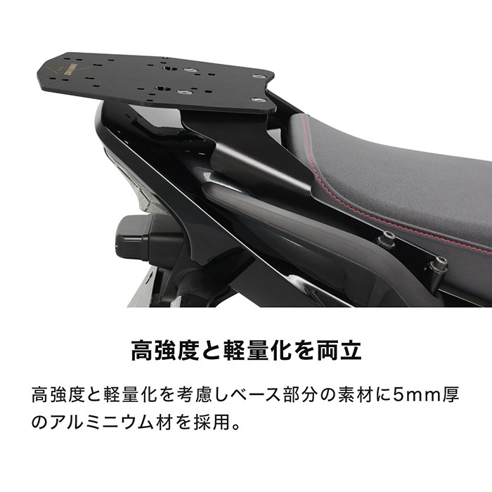 ツーリングに欠かせないBOXベースプレートとボックスが一緒になったセット! ベースプレート部は高強度と軽量化を考慮し、5mm厚のアルミニウム材を採用。 |